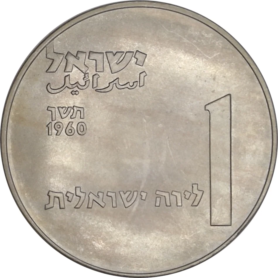 "Israel" in Hebrew and Arabic. Mint year "5720-1960". Face value: "1 Israeli Lira".