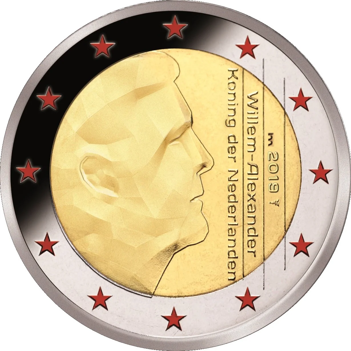 Right effigy of King Willem-Alexander with the inscriptions "Willem-Alexander Koning der Nederlanden" and the year. The outer ring features the twelve red stars of the European flag.