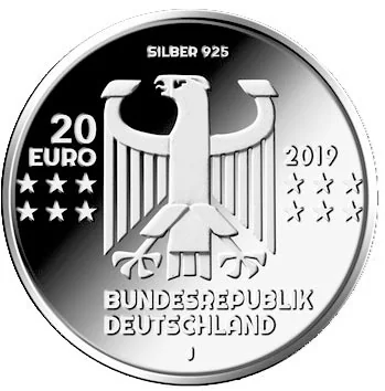 Germany's stylized federal eagle, surrounded by the EU's twelve stars. Above is "SILBER 925"; below, "BUNDESREPUBLIK DEUTSCHLAND" and the mintmark "J". The year is on the right, and the face value "20 EURO" on the left.