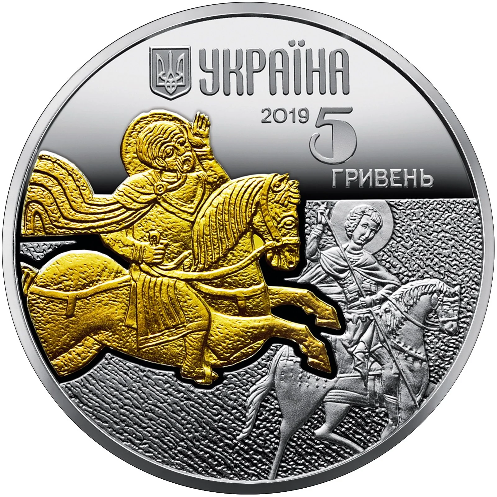 The small State Emblem of Ukraine with the inscription UKRAINE, the year 2019, and the face value 5 гривень. Centered is a gilded fragment of an 11th-century Kyiv stone relief depicting St. Eustace, set against a 15th-century icon image of St. George.
