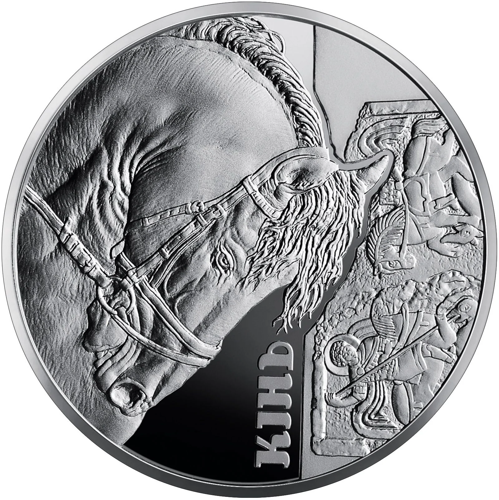 A horse's head left, with "KIHb" (The Horse) to its right on a mirrored background, alongside an 11th-century slate fragment depicting saintly riders trampling a snake.