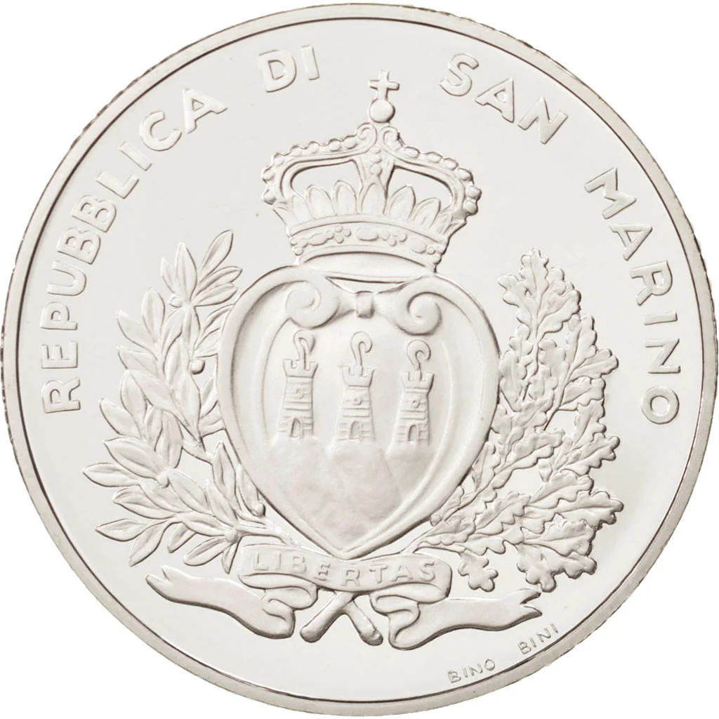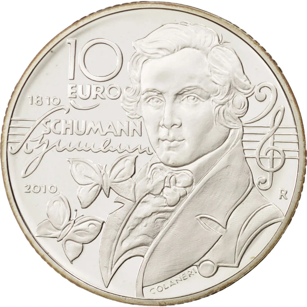 Description: A portrait of Robert Schumann from a period drawing, set against a musical background with F and G clefs. It features his signature, "SCHUMANN," his birth year "1810," two butterflies referencing his Op. 2, the issue date "2010," the "10 euros" denomination, the engraver "Colaneri," and an "R."