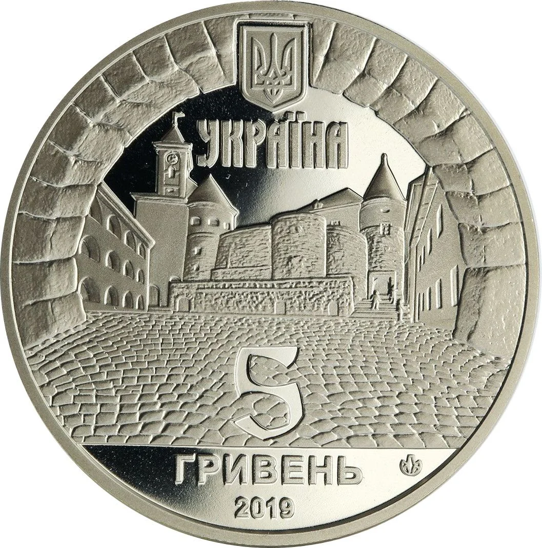 A stylized castle courtyard with Ukraine's small coat of arms and "УКРАЇНА" above the brick gate. Below, on the cobblestones, is the denomination "5" and mirrored text reading "ГРИВЕНЬ" with the year 2019.