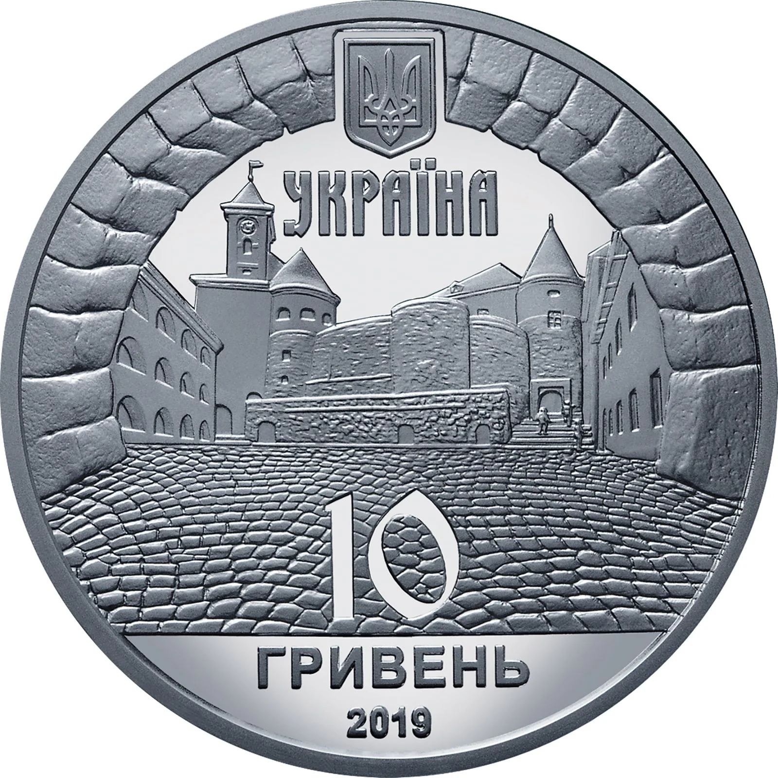A stylized castle courtyard with Ukraine's small coat of arms and "УКРАЇНА" above the brick gate. Below, on the cobblestones, is the denomination 10 and a mirrored inscription of "ГРИВЕНЬ" with the year 2019.
