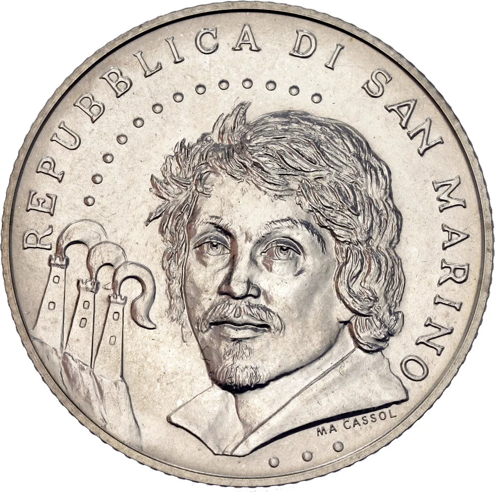 Caravaggio's face appears in the foreground, with San Marino's three-tower and three-feather symbols at lower left. The design includes the legend "Republic of San Marino" and the artist's name "CASSOLA MA."