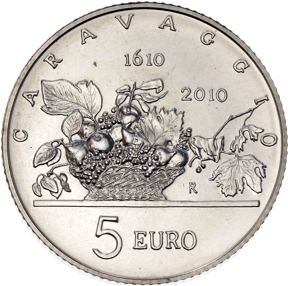 Foreground: "Fruit Basket" painting. Value "EURO 5" with years "1610" and "2010." Legends: "Caravaggio" and the Italian Mint's "R."