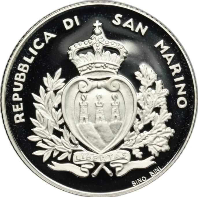 Republic of San Marino emblem, with legend and artist "Bino Bini" noted.