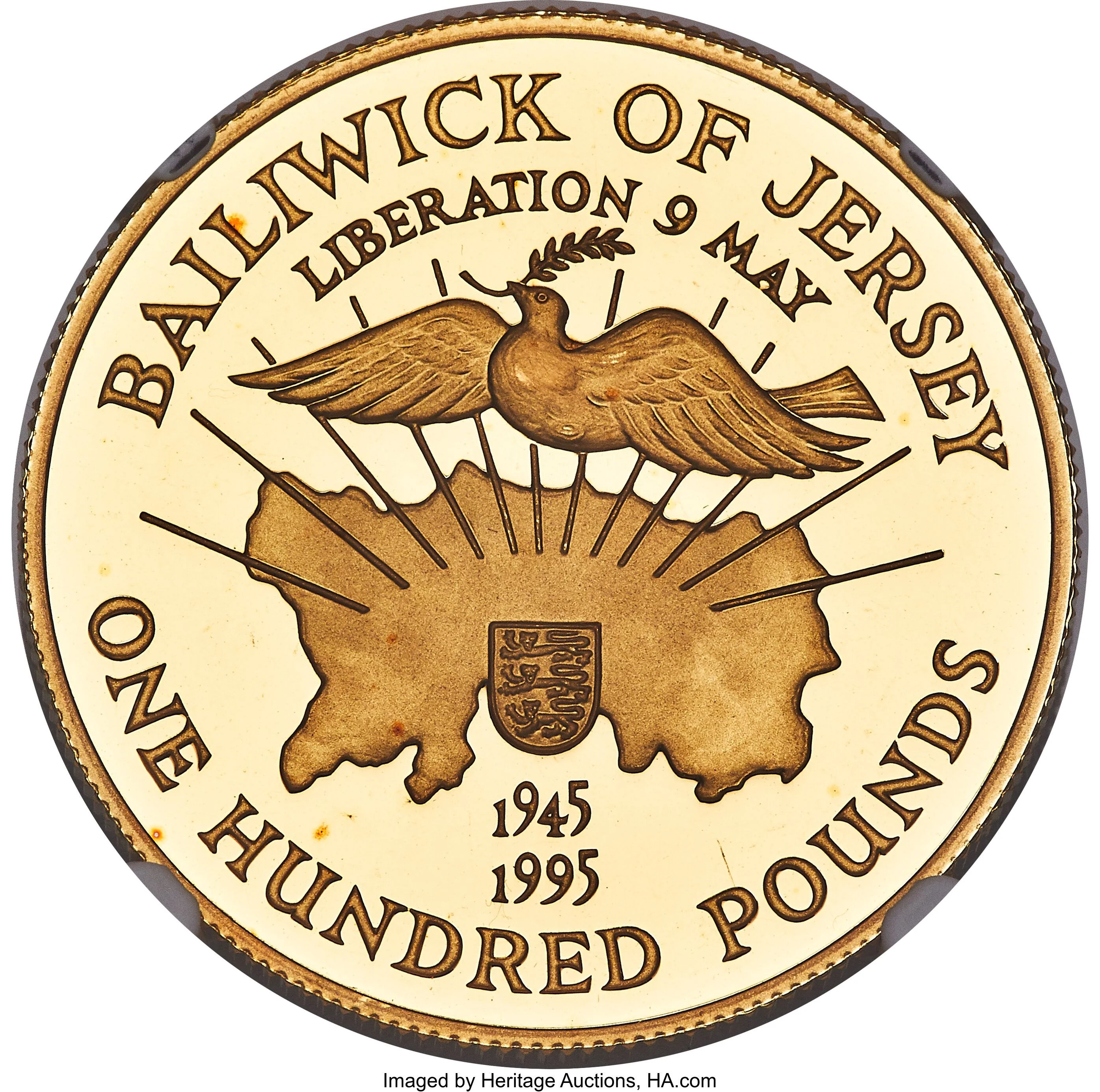 Peace Dove over Jersey map with coat of arms.