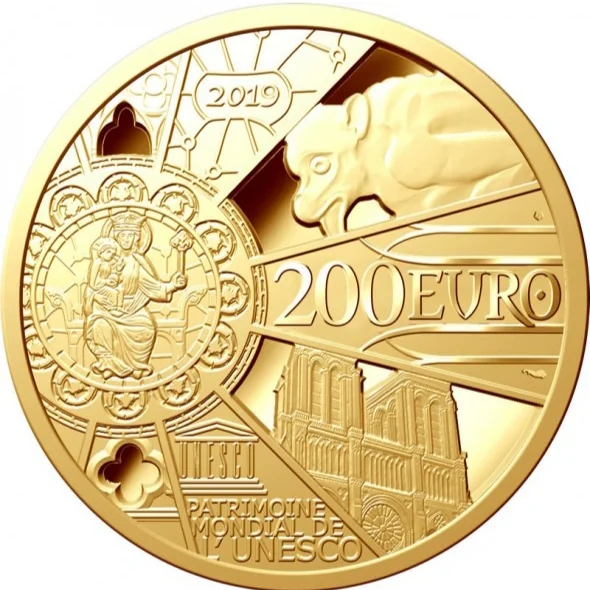 The coin depicts part of the rose window, with its center and rays. The solid sections bear the inscriptions "15/04/2019 Reconstruction," "Notre Dame de Paris," and "RF," while the openwork sections feature a gargoyle, the cathedral's western façade, and architectural details.