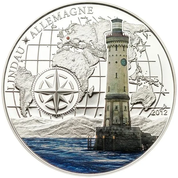 The motif features Germany's Lindau Lighthouse, its southern location marked by a colored element. The name and country are inscribed in French along the edge, with the issue year (2012) at bottom left.