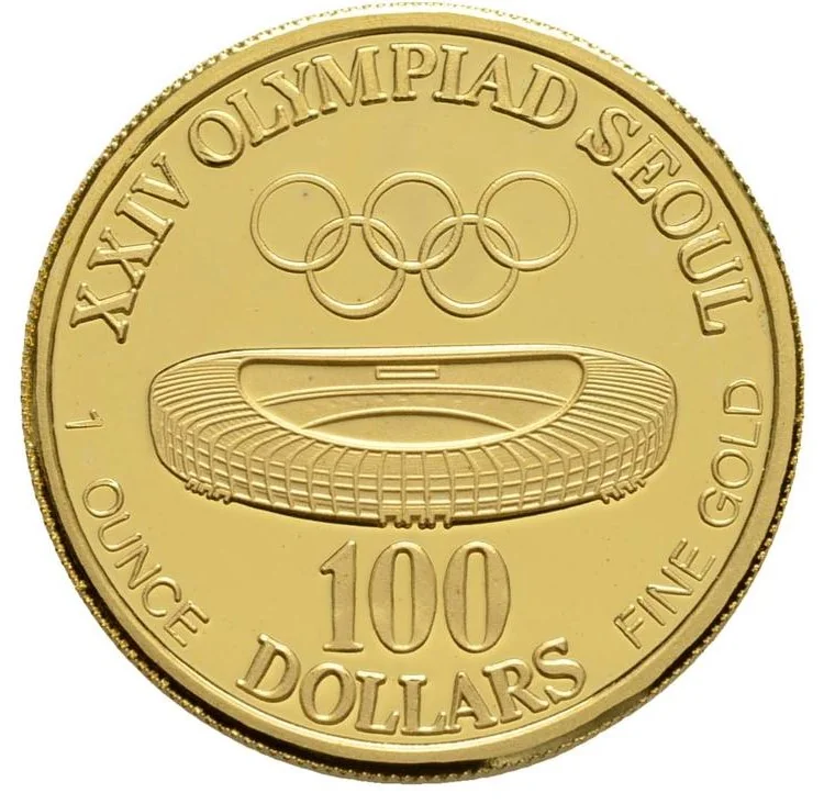 Olympic rings and Chamshil Stadium on currency.