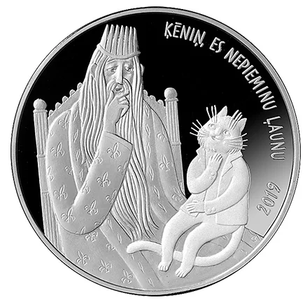 Centered is a cat on the King's lap, with the inscription "ĶĒNIŅ, ES NEPIEMINU ĻAUNU" and the year 2019 in a semi-circle to the right.