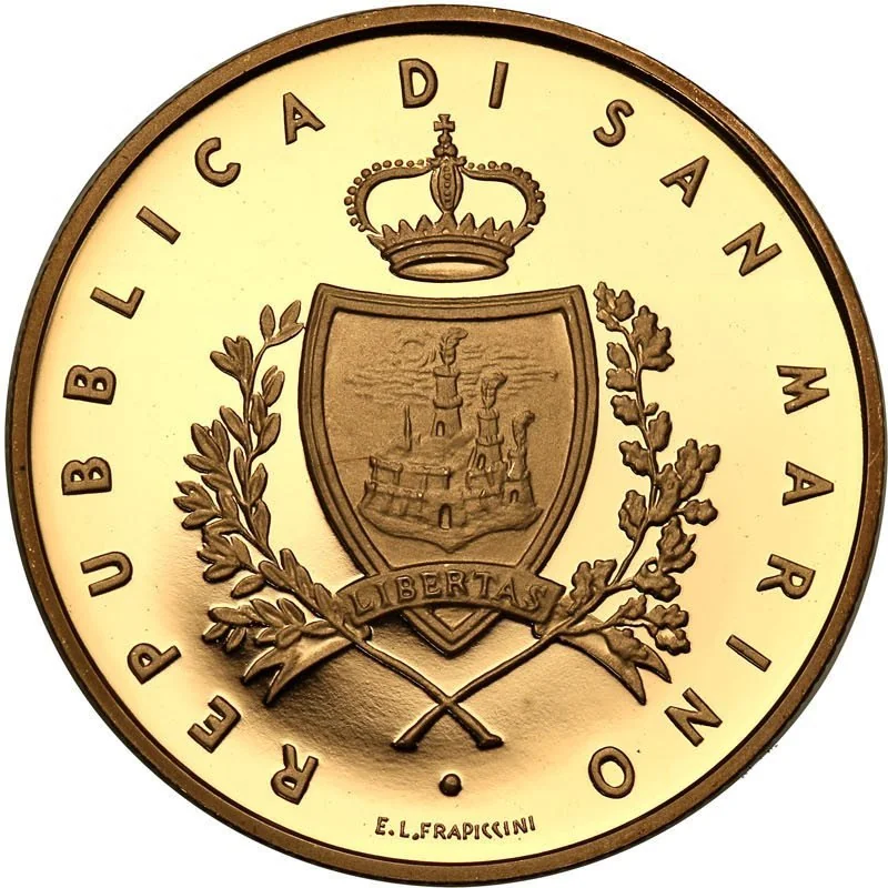 The coat of arms of San Marino, featuring a crowned hill with three towers and feathers, is flanked by laurel and oak branches. The engraver's name is at the bottom, and "Republic of San Marino" encircles the coin.