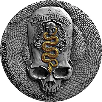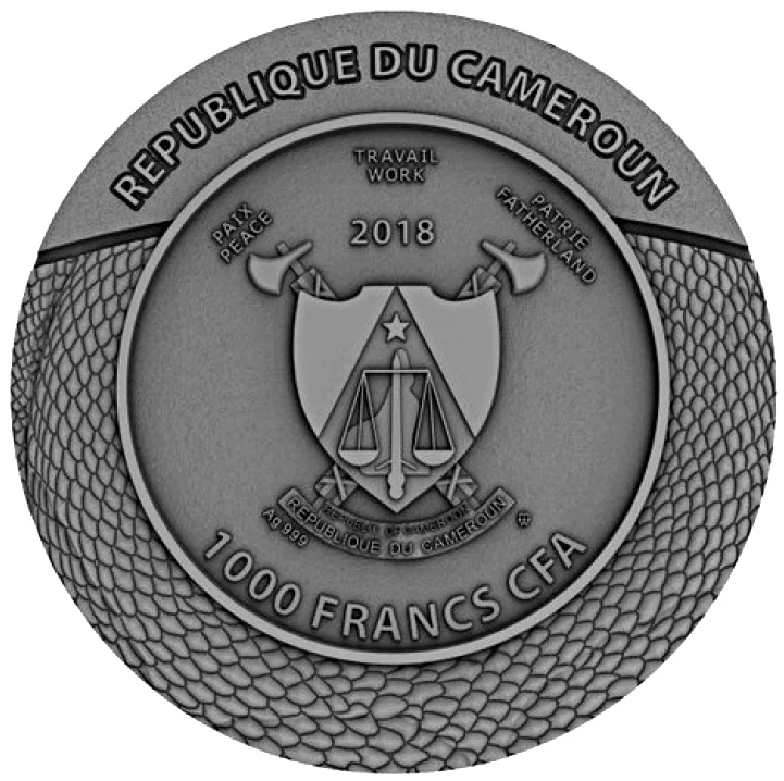 Description: Cameroon coat of arms on a snakeskin pattern within a circle.