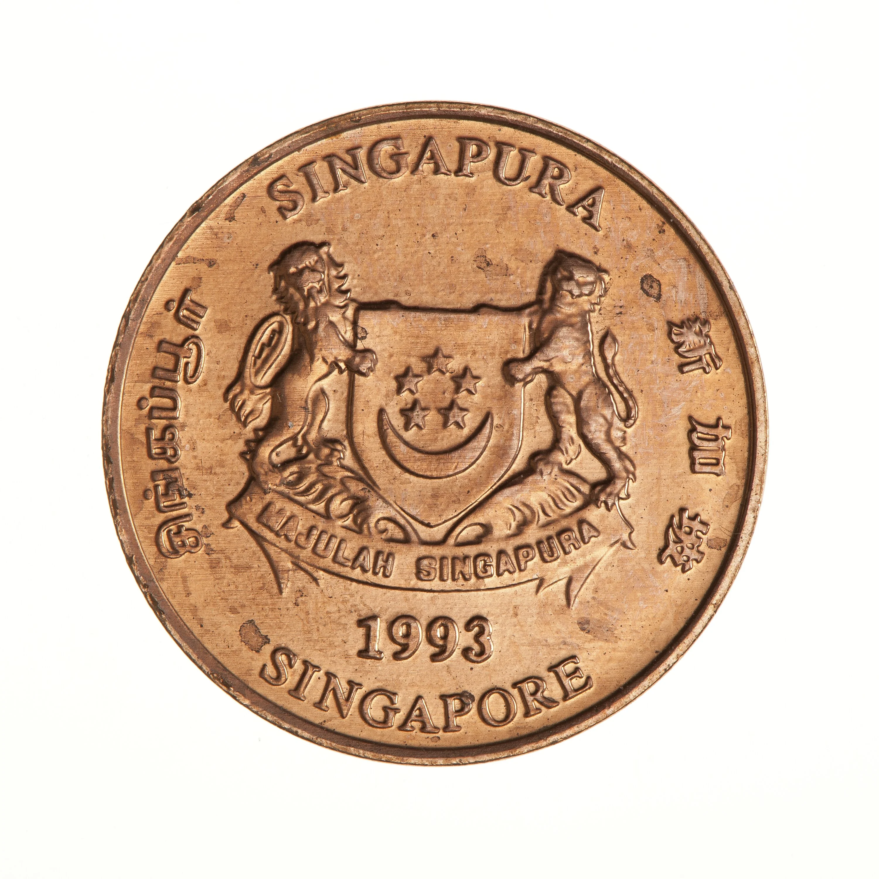 Emblem with date below and 'Singapore' in English, Tamil, Chinese, and Malay on four sides.
