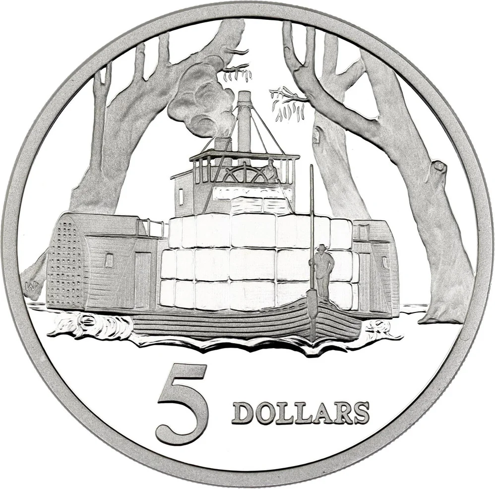 Riverboat with river gum trees behind. Denomination value below.