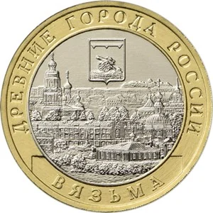 A relief panorama of Vyazma, topped with the town's emblem, encircled by the inscriptions "ДРЕВНИЕ ГОРОДА РОССИИ" above and "ВЯЗЬМА" below.