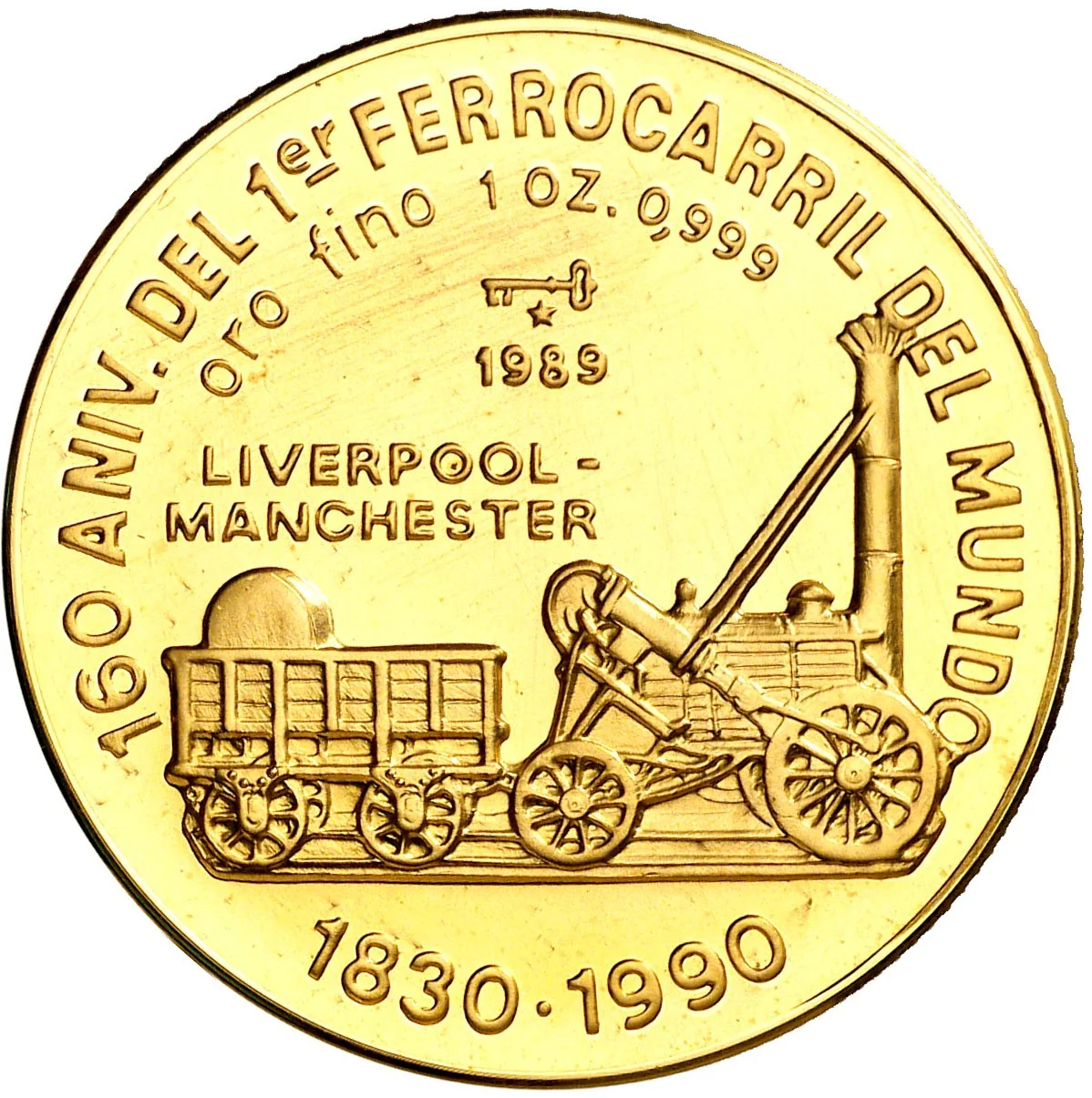 Image of the world's first intercity train (Liverpool-Manchester line). Curved legend above and on sides, mintmark and issue date centered over the train, with the route line superimposed. Anniversary dates below.