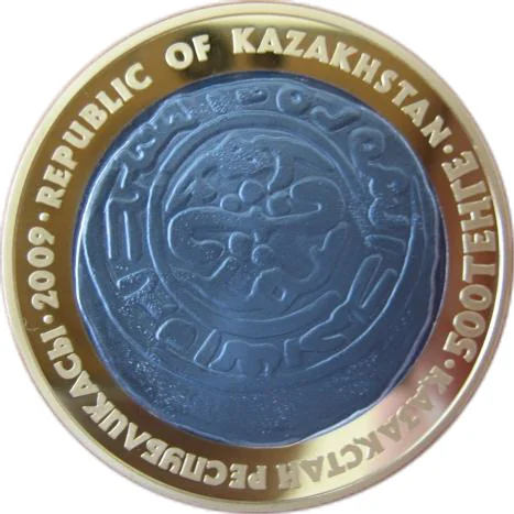 Description: The obverse features a gilded 13th-century dirham from the Almaty mint, encircled by "ҚАЗАХНСТАН РЕСПУБЛИКАСЫ", "THE REPUBLIC OF KAZAKHSTAN", "500 TENGE", and "2009".
