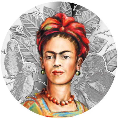 Colourized portrait of Frida Kahlo facing front-left, with parrots and a monkey.
