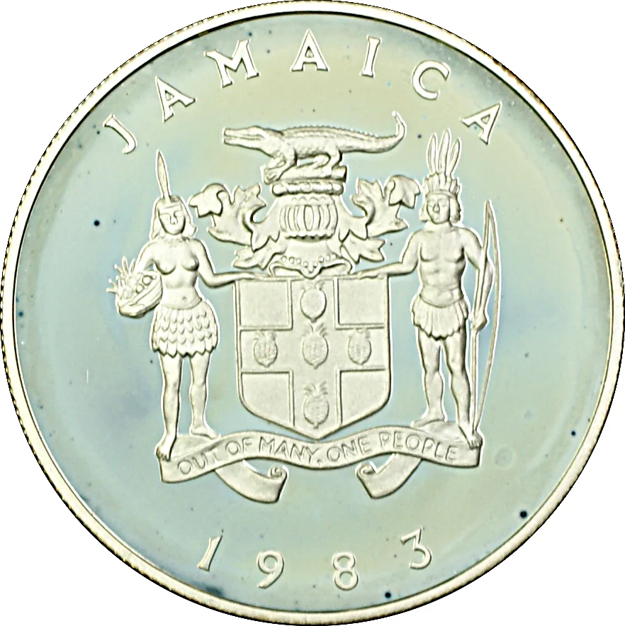 Conjoined busts of Elizabeth II and Prince Philip facing left, flanked by small shields.