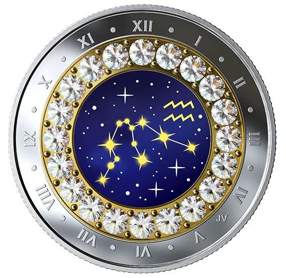 Roman numeral ring, Swarovski crystal inner ring, and a colored Aquarius zodiac image with constellation and glyph.