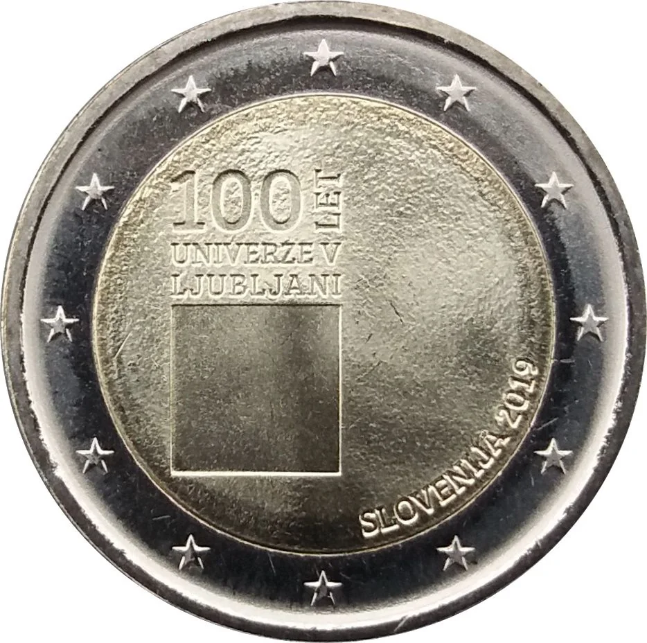 Centered is the University of Ljubljana's logo, with its facade replaced by the inscription '100 LET UNIVERZE V LJUBLJANI' to the left. A textured background emphasizes the inscription and logo. The country name and date are on the lower right, with the European stars on the outer ring.