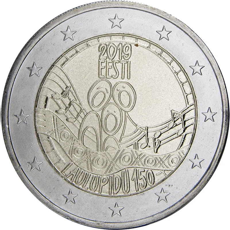 Inspired by the Song Celebration procession, which moves like a wave of national dress, pride, and joy, this design unites music, costume, and event sites. It includes the first notes of the Estonian anthem and the text ‘Laulupidu 150’. The top features the year ‘2019’ and ‘EESTI’, surrounded by the 12 stars of the European flag.