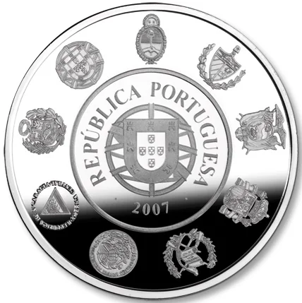 Portuguese coat of arms surrounded by those of Argentina, Cuba, Ecuador, Spain, Guatemala, Mexico, Nicaragua, and Peru.