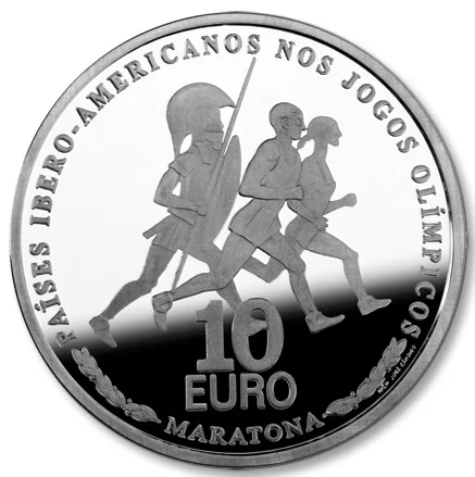 Ancient runners, central "10 EURO", "MARATONA" with olive branches, and "PAISES IBERO-AMERICANOS NOS JOCOS OLIMPICOS" above.