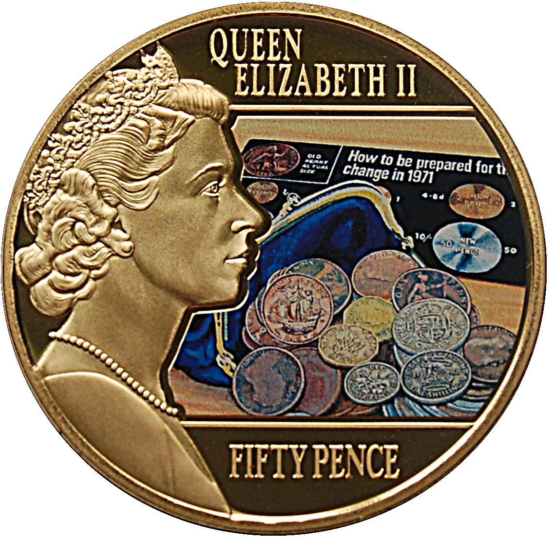 Queen Elizabeth II facing right, with coins in color.