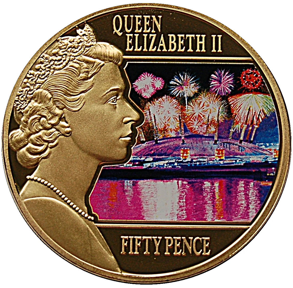 Queen Elizabeth II facing right with the Millennium Dome fireworks.