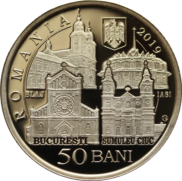 Places of worship and their cities: St. Joseph’s Cathedral – BUCURESTI, Marian Shrine – SUMULEU CIUC, Holy Trinity Cathedral – BLAJ, Our Lady Queen Cathedral – IASI, to be visited by Pope Francis. Also featured: "ROMANIA", the year "2019", Romania's coat of arms, and face value "50 BANI".