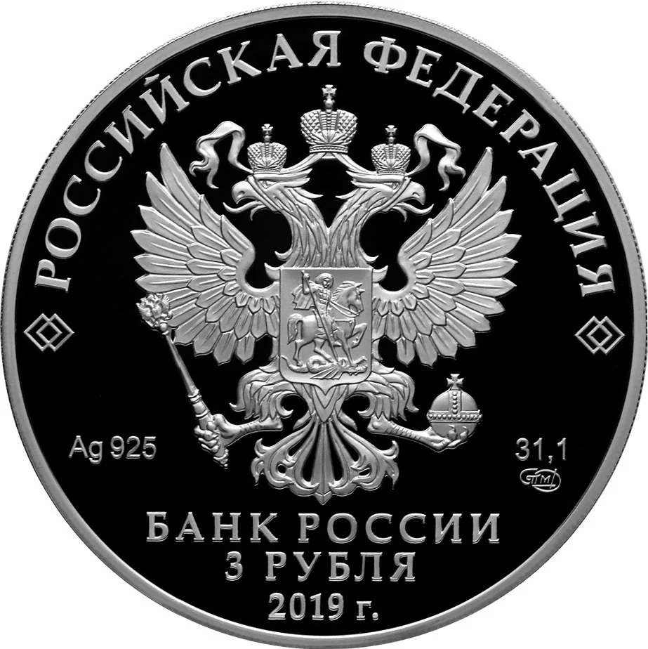 The obverse features the Russian Federation coat of arms with the country name above. Below are the metal specifications, mint mark, and the inscriptions "BANK OF RUSSIA," "3 ROUBLES," and the year.