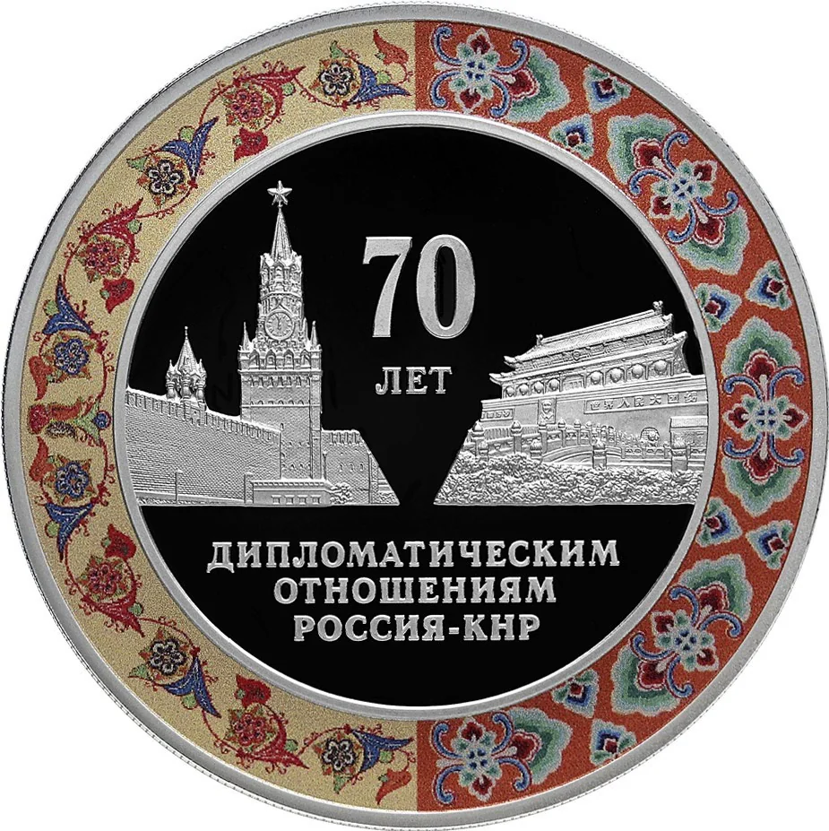 A relief of Moscow's Spasskaya Tower and Beijing's Tiananmen Gate. Below, the inscription: '70 ЛЕТ ДИПЛОМАТИЧЕСКИМ ОТНОШЕНИЯМ РОССИЯ—КНР' (70 YEARS OF RUSSIA—PRC RELATIONS). The coin's circumference features a 16th-century Russian ornament and stylized Chinese floral patterns.
