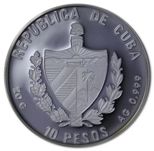 Cuban coat of arms with country name above, face value below, and fineness and weight on the sides.