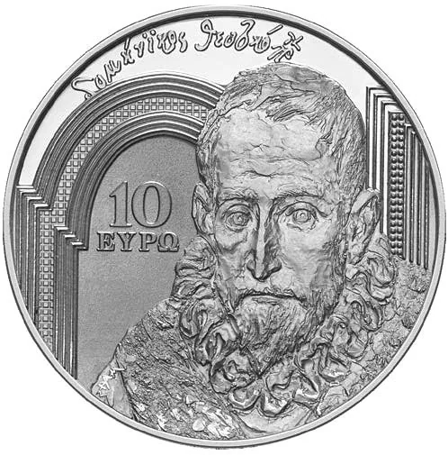 Portrait of El Greco (1549-1614) on a purple glow background, with "10 EURO" to the left.