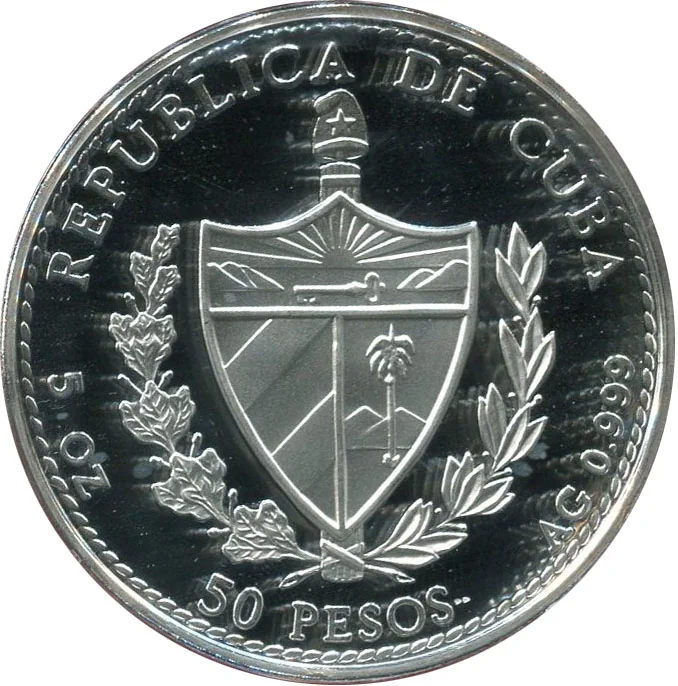 Cuban coat of arms with country name above, face value below, and fineness and weight on the sides.