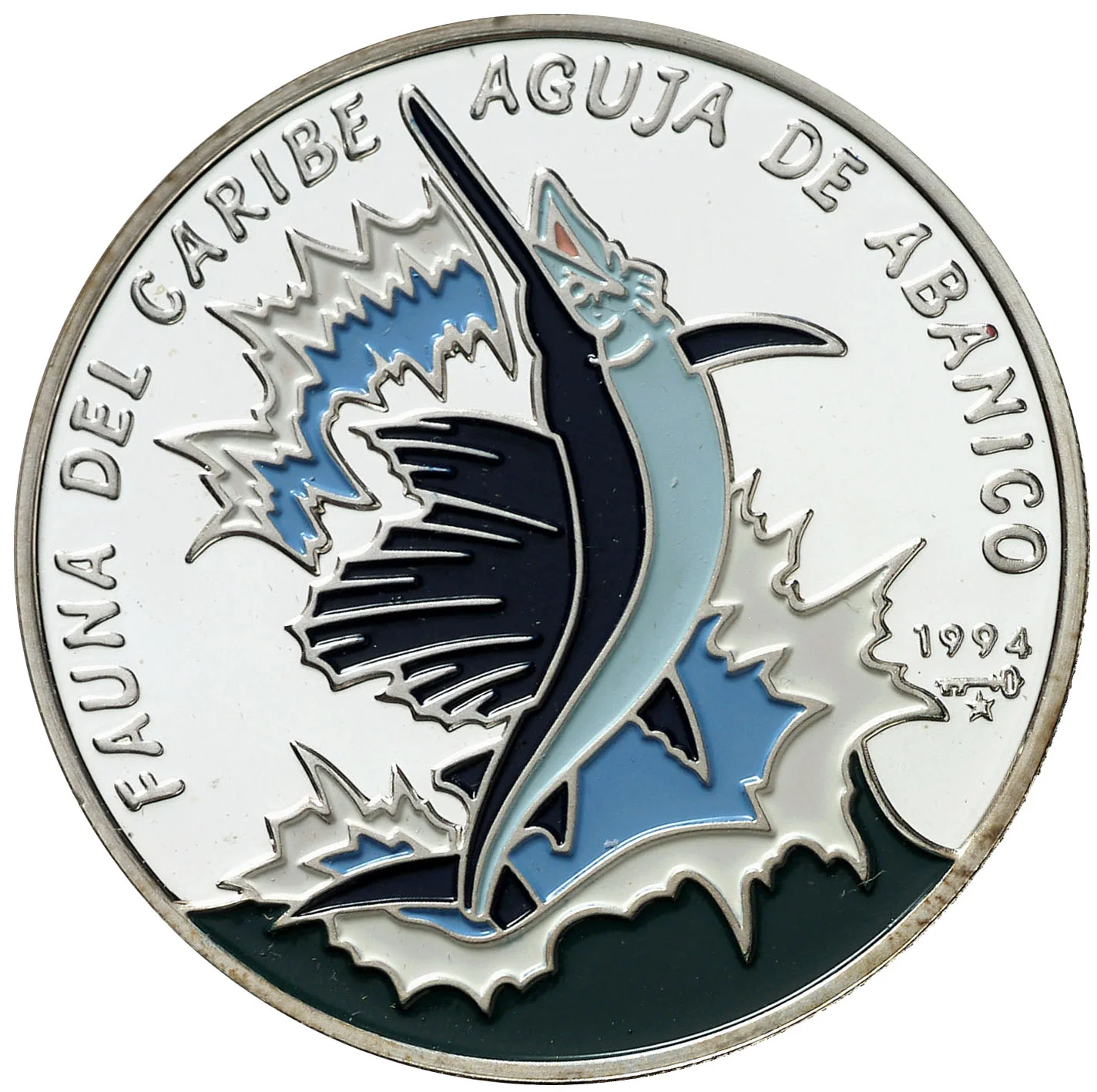 Colorized Sailfish. Curved legends on sides and top. Year and mintmark on right.