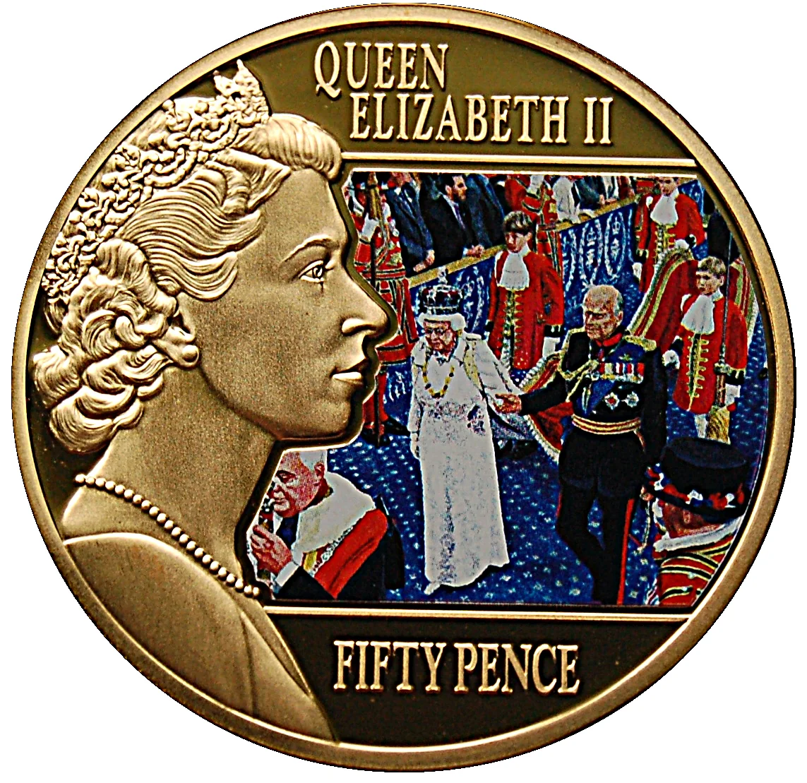 Queen Elizabeth II facing right, with MPs in color attending her in the Lords Chamber.
