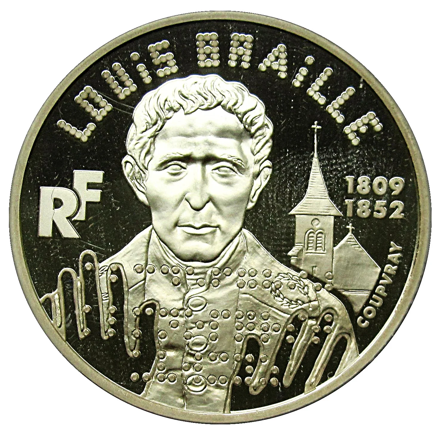 Bust of Louis Braille, his hands reading a three-line braille alphabet. The Coupvray church, his birthplace, is behind him. His birth and death dates are shown.