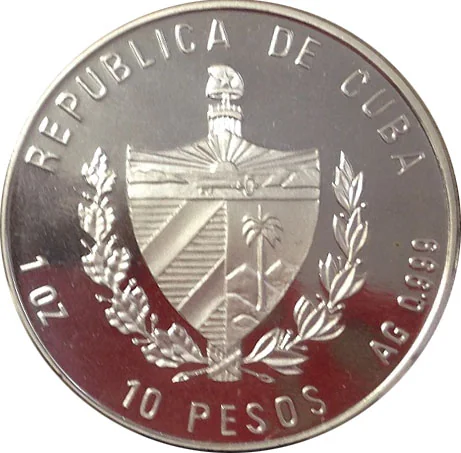 Cuban coat of arms with country name above, face value below, and fineness and weight on the sides.
