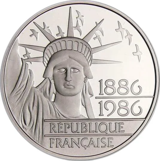The Statue of Liberty, flanked by eleven birds, bears the dates "1886-1986" and the inscription "FRENCH REPUBLIC."