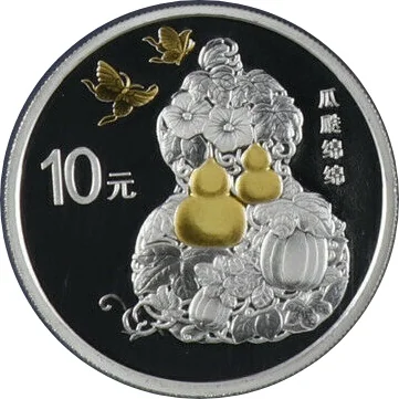 A calabash pattern with pumpkins, vines, butterflies, and the Chinese idiom "gua die mian mian" (meaning "plentiful offspring"), plus the face value.