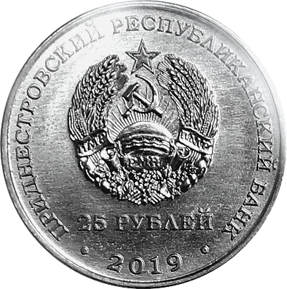 State Emblem of the Transnistrian Moldavian Republic. Circular inscription: top - "ПРИДНЕСТРОВСКИЙ РЕСПУБЛИКАНСКИЙ БАНК" (Transdniest Republican Bank), bottom - "25 РУБЛЕЙ" (25 Roubles). Below the emblem, the year "2019".