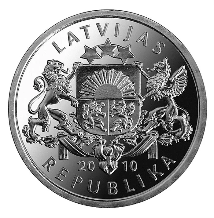 The Latvian coat of arms with "2010" below is centered, with "LATVIJAS" arched above and "REPUBLIKA" arched below.