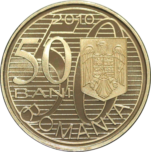 Descending order: year "2010", face value "50 BANI", Romania's coat of arms with arched "ROMANIA" inscription; on a lined background, a large numeral "50".