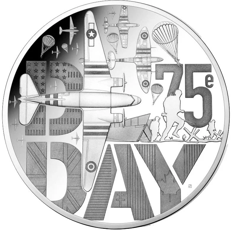 The reverse depicts the military operations of June 6, 1944. Centered on "D-DAY" and the flags of the Allied nations, it features a Dakota aircraft with USAF and RAF markings flying over the scene, accompanied by Spitfire and Mustang fighters. The design includes paratroopers and smaller aircraft representing airborne assaults, with landing barges for ground forces in the center.