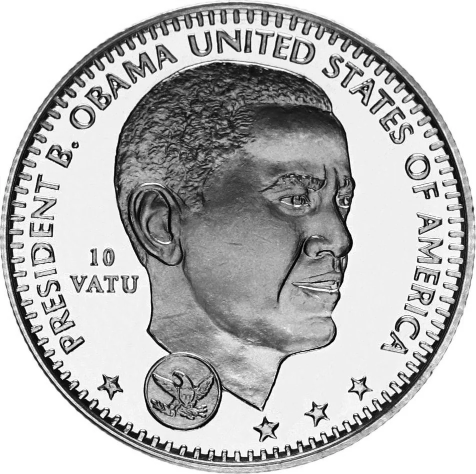 Description: Vanuatu's arms depict a Melanesian warrior before a curved boar's tooth, a scroll reading "LONG GOD YUMI STANAP," and the date.