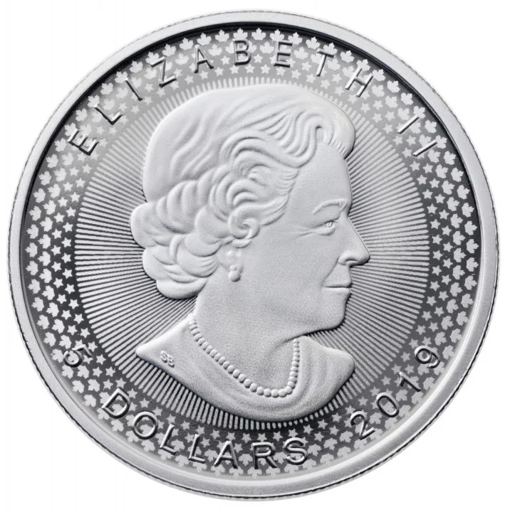 Queen Elizabeth II at 77, facing right, wearing a necklace and earrings. Radial background with perimeter stars and maple leaves.